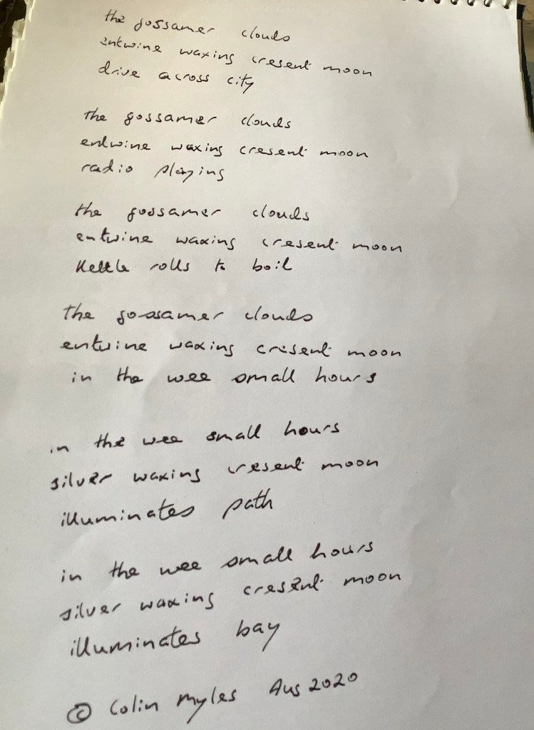 Crescent Moon 6 Haiku Colin Myles P.S. Let me know what you think of handwritten as opposed to typed in comments Share this: Click to share on X (Opens in new window) X Click to share on Facebook (Opens in new window) Facebook Like Loading... Related Author: colinmylesauthor I write haiku poetry and non-fiction books. Have a fondness for single origin coffee and enjoy a good glass of red wine on the weekend. View all posts by colinmylesauthor