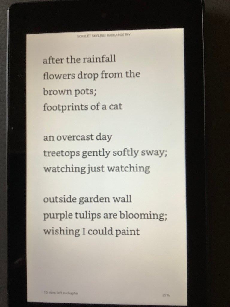 Three more Haiku – Scarlet Skyline three haiku from Scarlet Skyline Colin Myles P.S. Start reading Scarlet Skyline Today Share this: Click to share on X (Opens in new window) X Click to share on Facebook (Opens in new window) Facebook Like Loading... Related Author: colinmylesauthor I write haiku poetry and non-fiction books. Have a fondness for single origin coffee and enjoy a good glass of red wine on the weekend. View all posts by colinmylesauthor