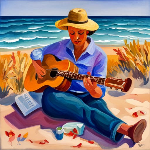 autumn day at beach free spirit strumming guitar; lapping waves applaud Colin Myles